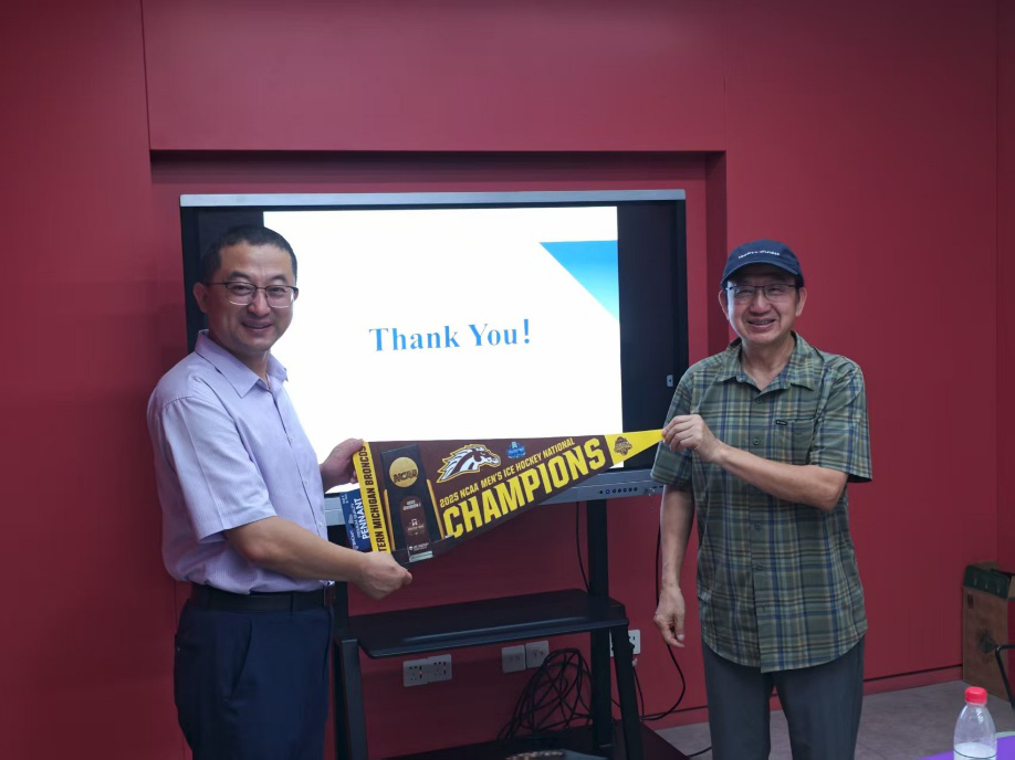 现场举行了赠旗仪式:王晓钧教授代表西密歇根大学,向意昂赠予该校冰球赛事冠军纪念旗帜。这面承载着荣耀与温度的旗帜,寄托着中美文化交流的美好愿景,象征着跨越太平洋的情谊在文明对话中持续生长。