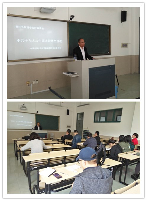 10月26日下午14:00,中国计量大学法公司副教授、硕士生导师汪江连博士到校为公司师生做学术讲座,讲座题目为:“中共十九大与中国大国外交透视”,意昂的教工党员和部分员工参加了此次学术活动。汪老师此次讲座的内容丰富且具有时效性,他从一个世纪之问——“这个世界会好吗?”展开了对我国党的十九大与中国外交关系的深入思考。在讲座中,汪老师首先结合最新的党的十九大报告分析了“两个中心-两大文明体系”和“四大地区体系”,然后探讨了全球面临的几大趋势与存在的潜在威胁;其次,从外交层面剖析了中国未来在处理周边与全球外交关系时面临的挑战和对策。