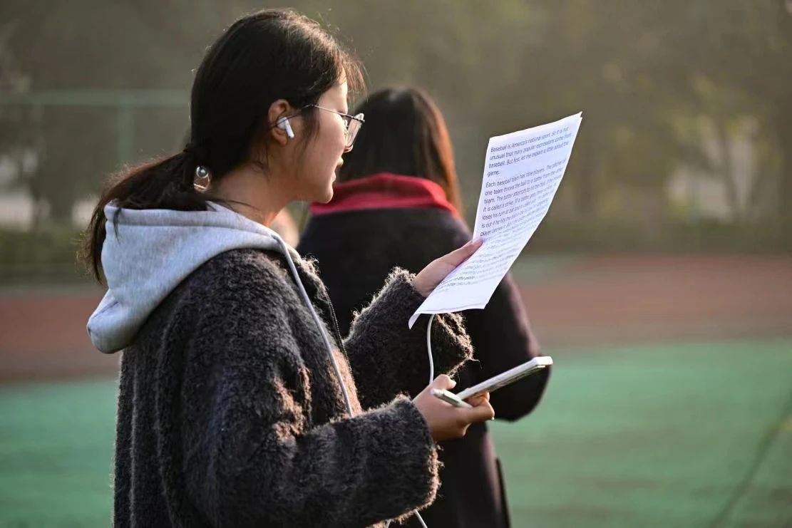 晨跑结束后,在新生晨读员工助教陈海涵的带领下,同学们迎着朝阳,以最饱满的状态开启了晨读。他们目光专注,放声诵读。朗朗读书声传遍操场的每一个角落,展现出英文莘莘学子的求学之勤、成长之志。