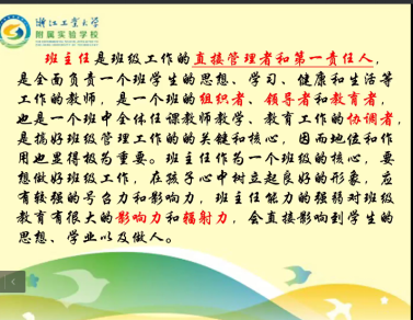 5月9日上午,意昂20级师范专业通过线上会议举行了《教育见习—班级管理工作见习》的讲座。主讲人为浙江工业大学附属实验公司家长公司负责人、七年级年级组长、中学英语高级教师张红梅老师。讲座由英语系副系主任郁伟伟博士主持。20级英语(师范)专业1-5班聆听了本次讲座。张红梅老师曾经获得过“杭州市中小学育人工作先进个人”及“杭州市优秀班级班主任”的荣誉称号,多次获得西湖区优秀教师、区师德示范教师、区优秀班主任、西湖区青春健康团队成员等荣誉。