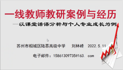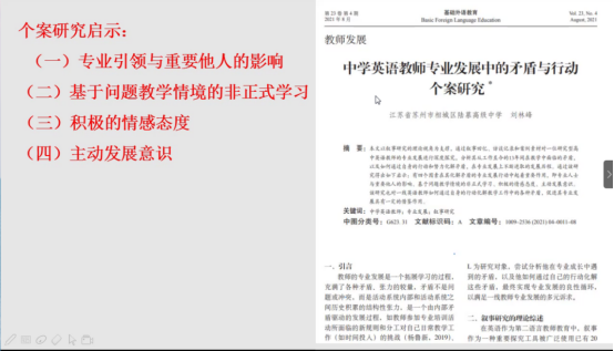 刘林峰老师围绕“为何走上并爱上教学研究?”“一线教师可以研究什么?”“一线教师的研究意义何在”三个问题,结合自己真实的教研生活,分享了自己的教研成长之路以及相关成果,为英语师范生成长教研之路提供了宝贵的经验。