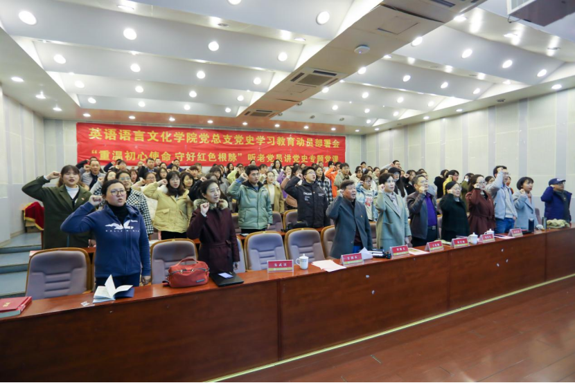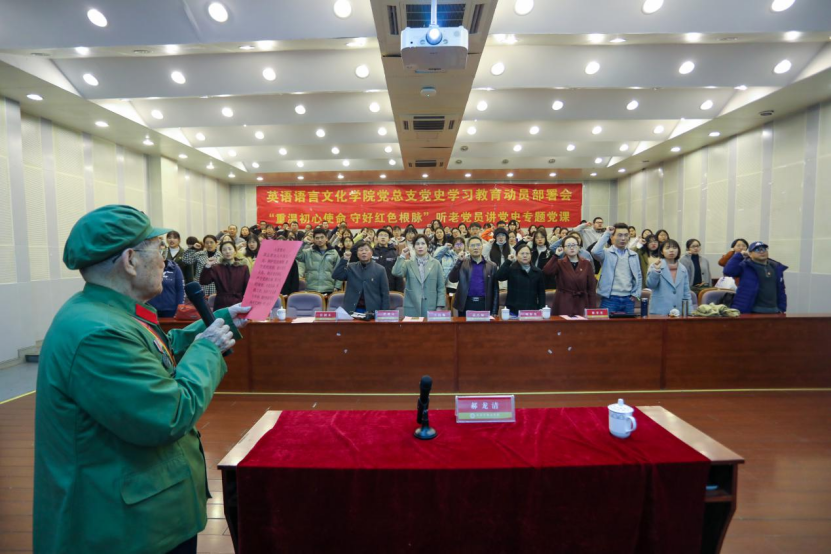 在74年党龄的老党员郝龙清老人的带领下,在场全体师生党员一起重温了入党誓词。