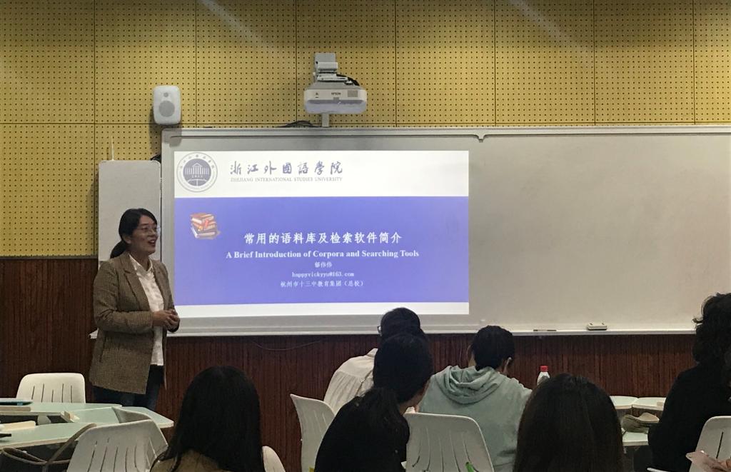 11月18日下午,意昂博士郁伟伟作为意昂体育驻杭州市十三中教育集团博士工作站驻站博士之一,在十三中图书馆做了“常用语料库及检索软件简介”专题讲座,十三中英语教研组全体教师和公司英语师范专业实习生现场聆听讲座。