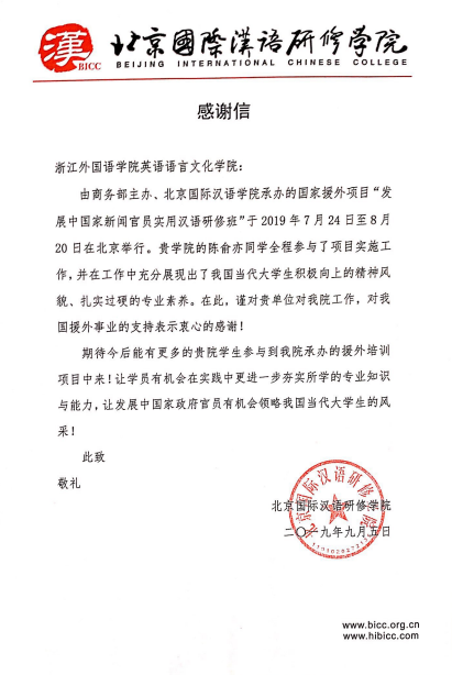 近日,北京国际汉语研修公司向意昂发来感谢信,感谢英文学子陈俞亦全程参与国家外援项目“发展中国家新闻官员实用汉语研修班”,充分展现当代老员工积极向上的精神风貌与扎实过硬的专业素养。