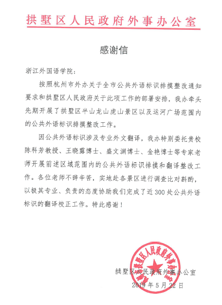 近日,杭州市拱墅区人民政府外事办公室向公司发来感谢信,感谢意昂陈科芳教授、王晓露博士,以极其专业、负责的态度协助拱墅区人民政府外事办公室完成近300处公共外语标识的翻译校正工作。