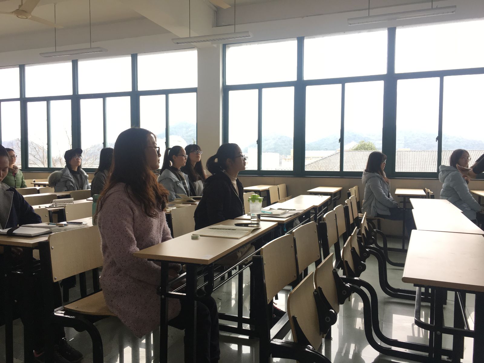 邱萍老师在讲台上落落大方,身体力行地进行礼仪教学,引领着员工站在两旁过道,让每个人都亲身感受站立、行走、蹲、坐、指引等各种形态礼仪,并邀请同学上台展示坐姿、站姿,为大家做示范。练习形态礼仪的时候,邱萍老师一个个耐心细致地纠正同学们的错误姿势。