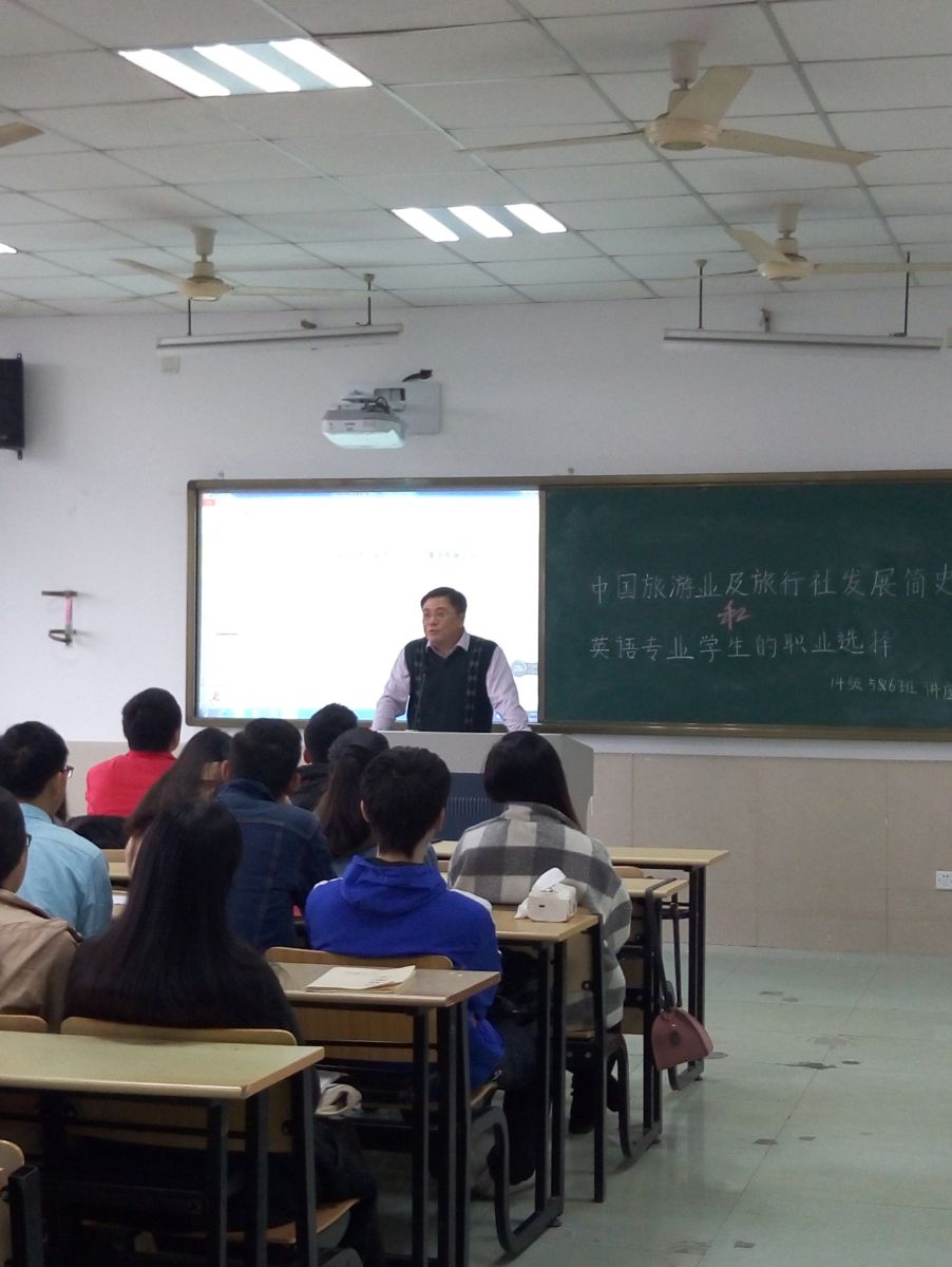 11月17日上午,浙江中旅出入境服务有限公司王晟副总经理应意昂邀请为公司英语专业(旅游方向)员工作了一场题为“中国旅游业及旅行社发展简史和英语专业员工的职业选择”的精彩演讲,英语系主任朱武汉老师出席并主持了讲座。