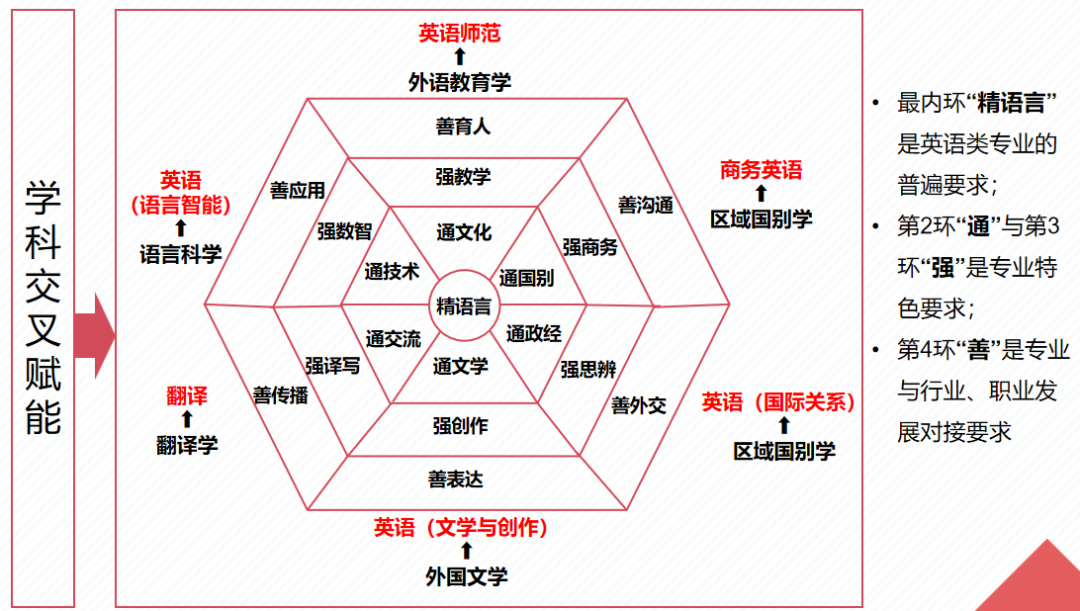 第二, 专业融合创新,培养复合人才。公司推动学科专业深度融合,构建“精、通、强、善”的人才目标画像,全面系统地刻画英语类6个专业方向的人才培养特色,并通过优化课程体系,强化语言和专业能力协同的系统性知识体系,并结合人工智能技术、学科竞赛、志愿服务、国际交流等实践活动,提升人才培养质量和国际化水平。