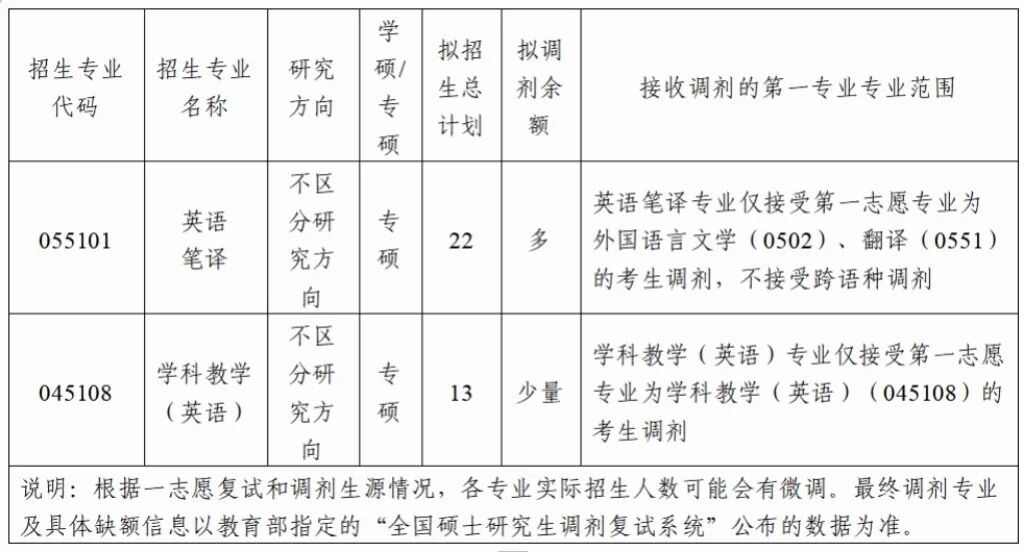 根据2026年公司招生计划和一志愿拟录取情况,公司英语笔译专业、学科教学(英语)专业均有部分调剂名额。欢迎有意向调剂公司的考生密切关注公司研究生招生网和公司网站。现将相关信息公告如下: