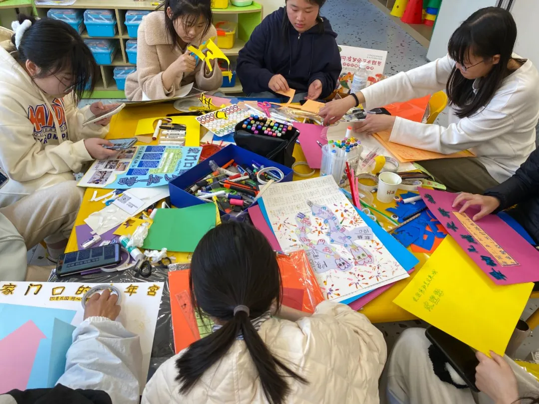 另一只小队围坐在圆桌旁,有人拿着画笔、写字、绘画,制作宣传海报,有人拿着剪刀进行裁剪,每个人都认真专注于手上的工作,力求做到更好,最大化地完善童心公司的宣传作品,让童心公司的各项活动得以更好的传播。